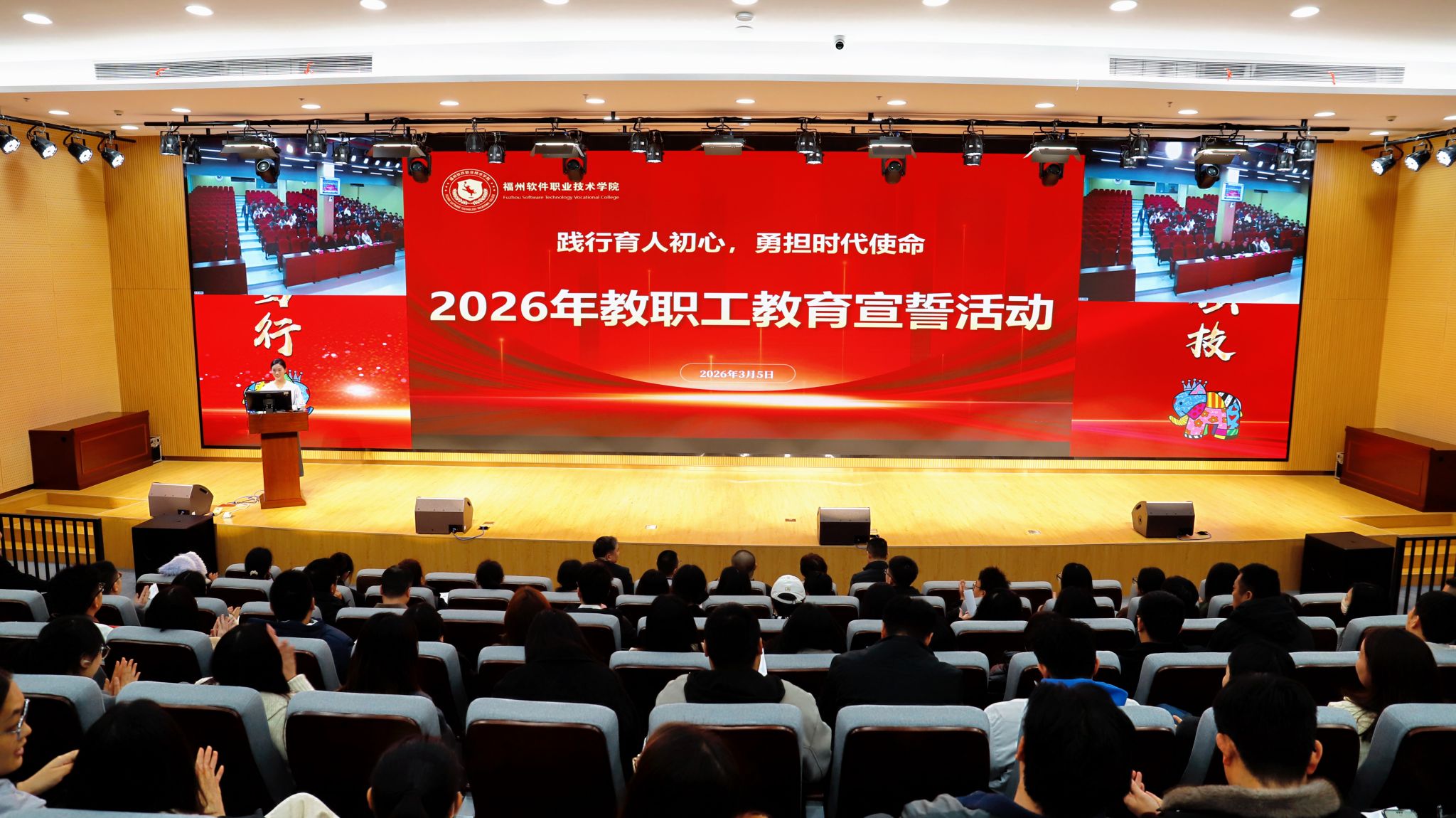 为深入贯彻立德树人根本任务,强化全体教职工的职业认同感、责任感与使命感,凝聚学校高质量发展合力,3月5日下午,福州软件职业技术学院以 “践行育人初心,勇担时代使命” 为主题,隆重举行2026年教职工教育宣誓活动。本次活动由俞飚理事长提议并全程参与,采用 “主会场 + 分会场 + 线上直播” 相结合的形式,全体教职工同步参与、共赴庄严之约,以铮铮誓言彰显福软教育人坚守教育初心、勇担育人使命的责任与担当。
